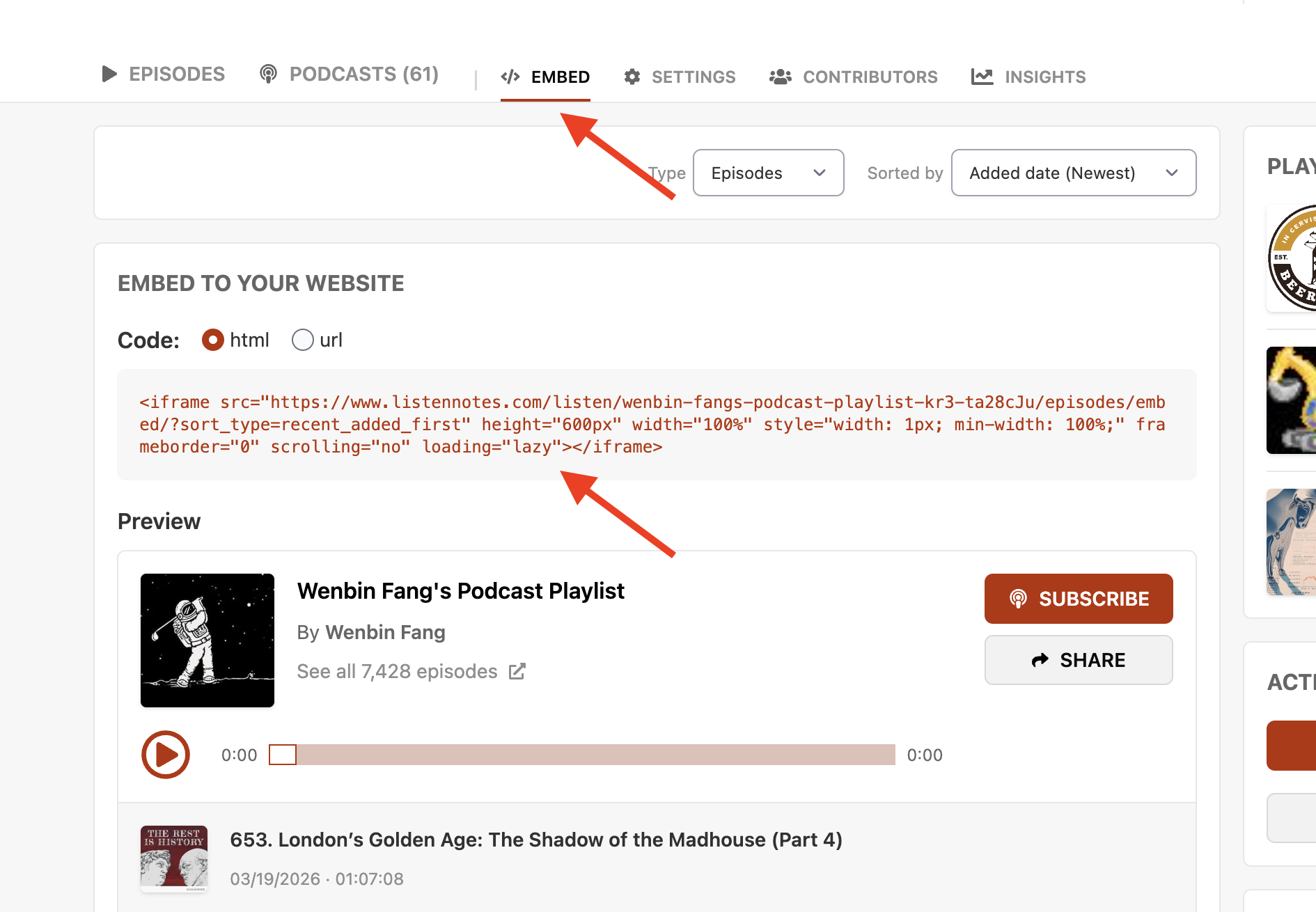 - RSS Feed: If you’ve curated a playlist of individual episodes, Listen Notes automatically generates an RSS feed for it. You and your audience can subscribe to this feed using any podcast app. Whenever you add a new episode, it will automatically appear in the podcast app of anyone subscribed to the RSS feed.